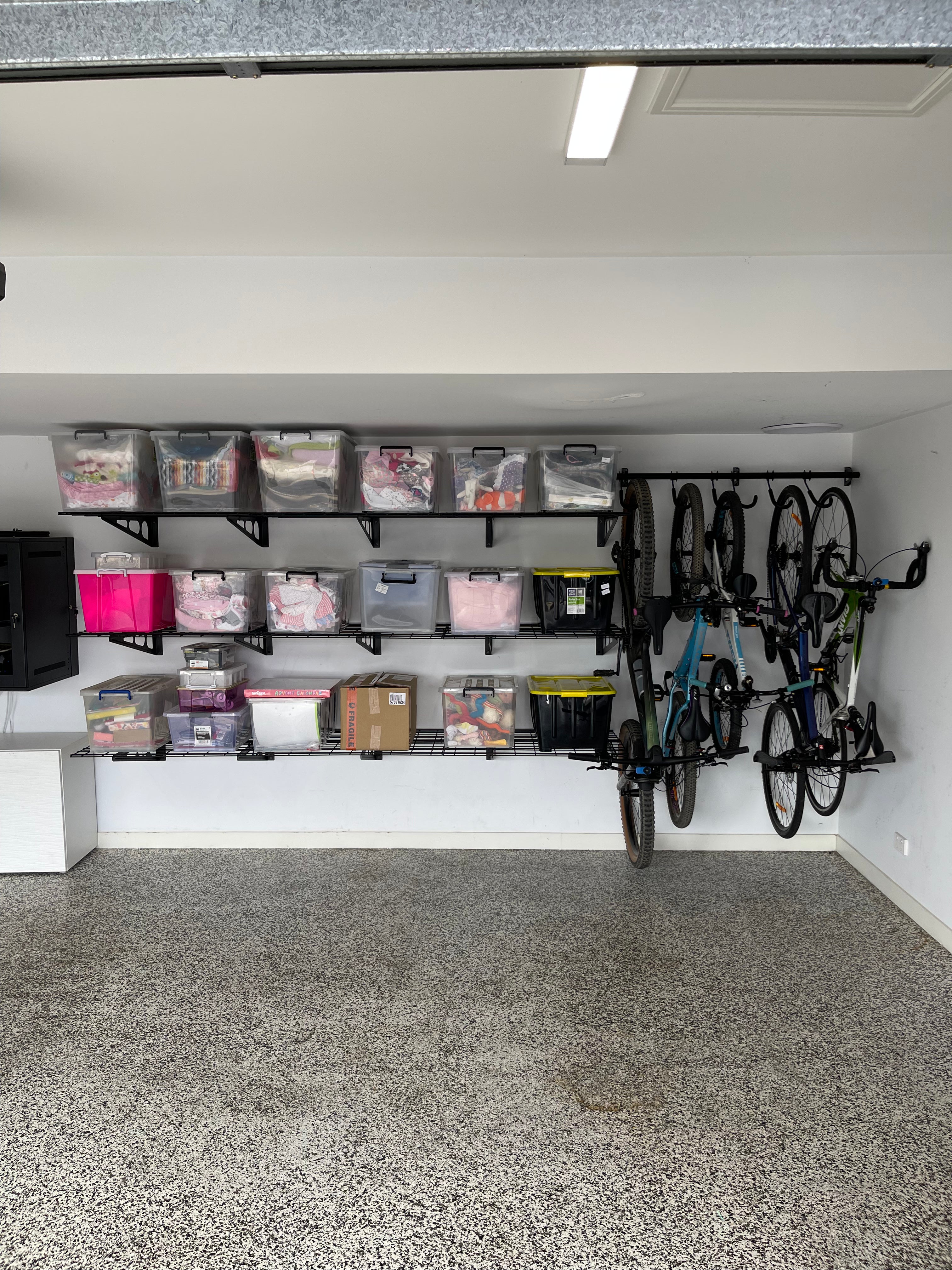 Achieve next-level organisation by combining vertical bike storage with high-capacity shelving.