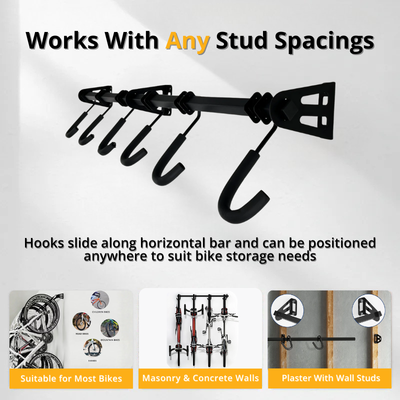 • Adjustable spacing, our hooks can be easily re-positioned anywhere along the rack to suit various bicycle sizes