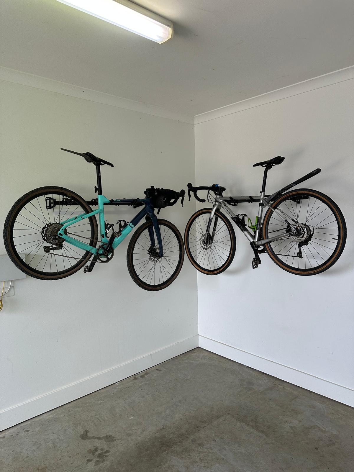 The bike hangs horizontally, flat against the wall, making it ideal for tight garage spaces and helping maximise wall storage.