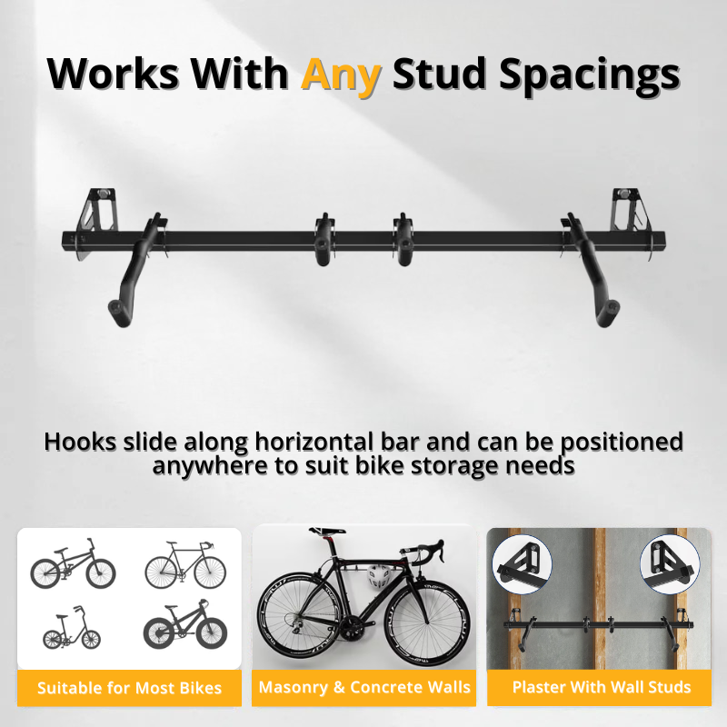 The Fleximounts® Horizontal Wall Mounted Bike Rack fits most standard bike types and sizes, including road bikes, mountain bikes, and fat tire bikes, with a maximum load capacity of 35 kg.