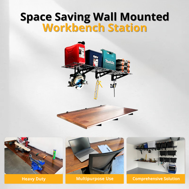 Combines a durable workbench and practical shelving into one complete, wall-mounted workspace solution.